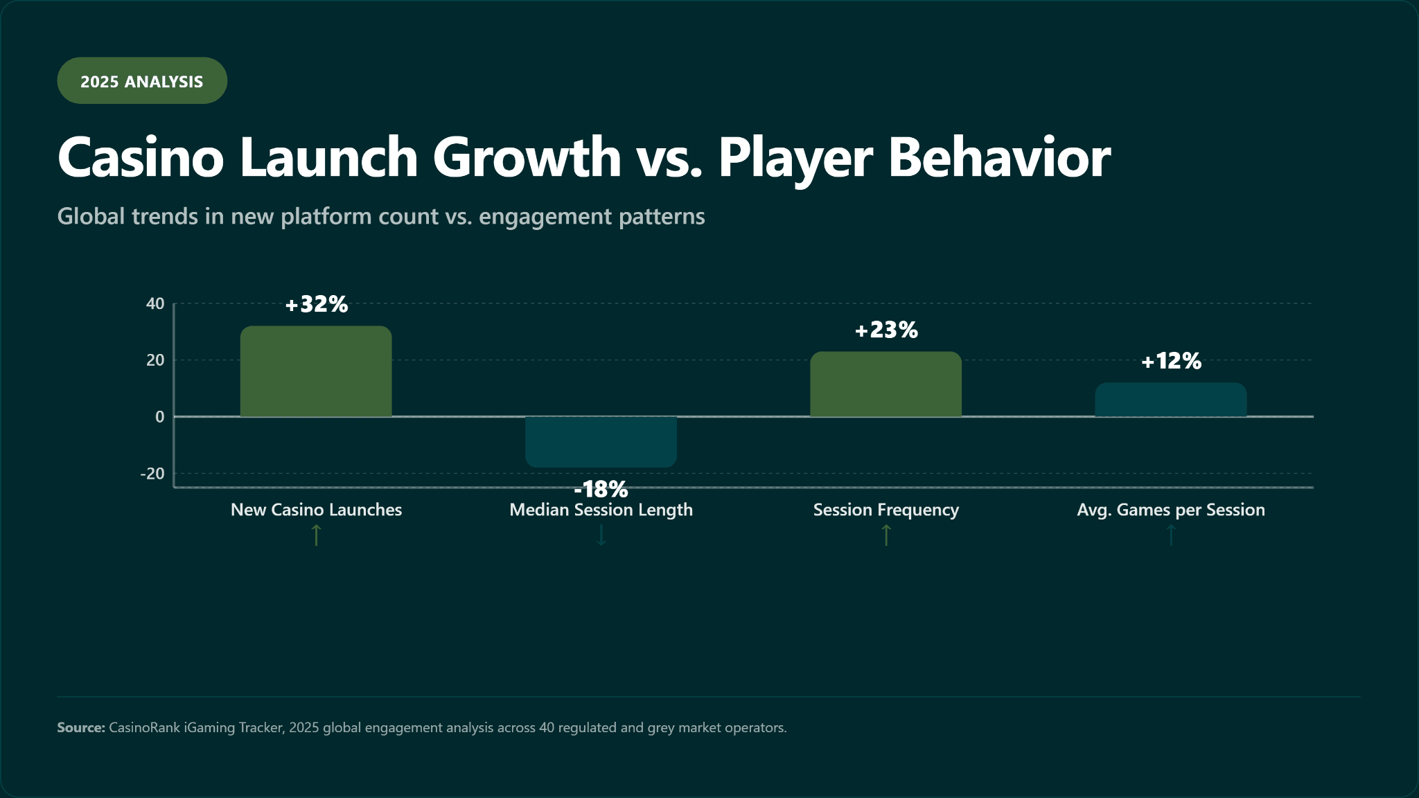 This chart shows how the 32% surge in new online casino launches during 2025 had little impact on player behavior. While supply expanded, session length declined by 18%, frequency increased by 23%, and average games per session remained unchanged, indicating that player engagement remained concentrated.